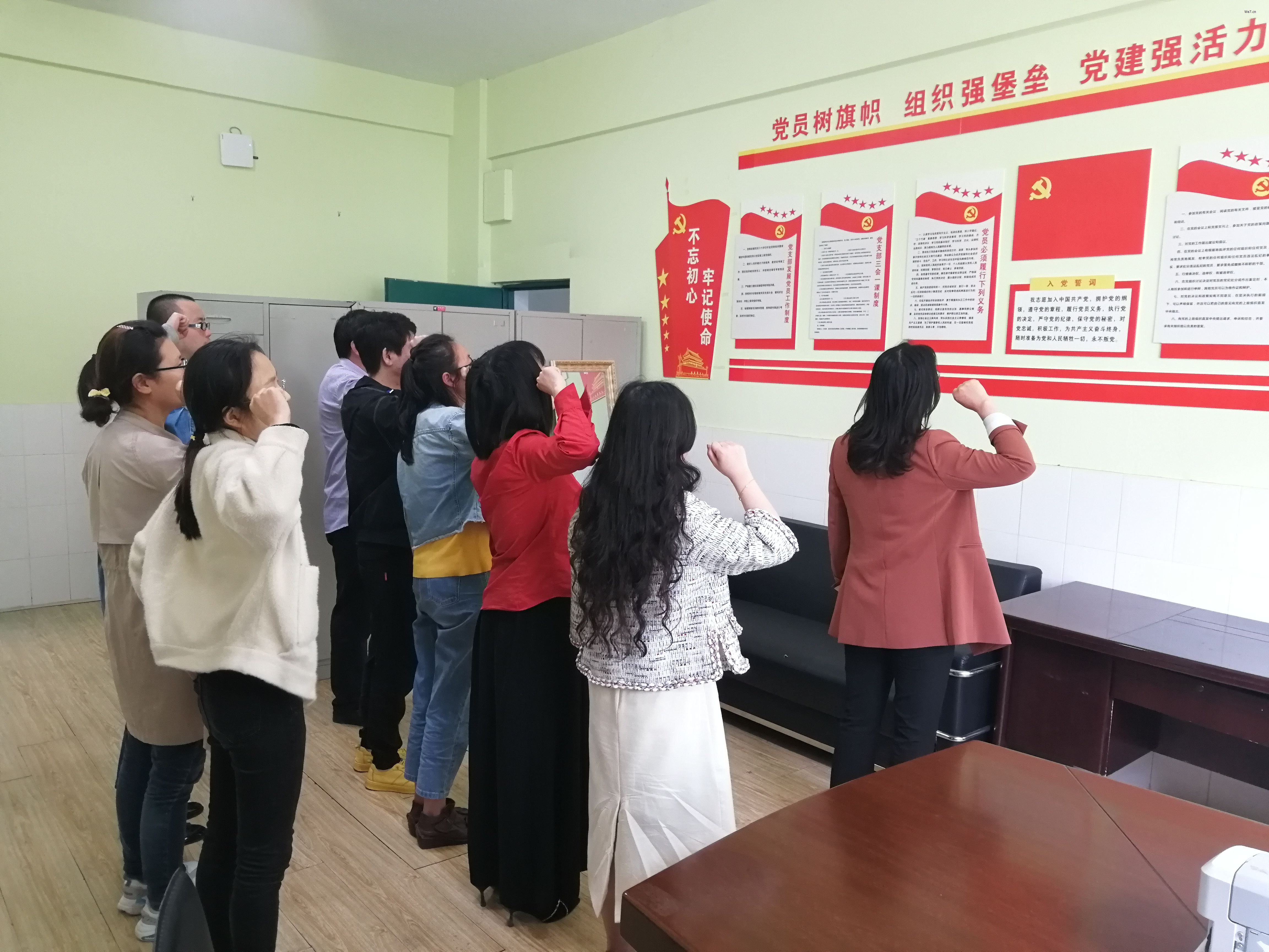 最后,在孙玉锦书记的带领下,全体党员在党旗前重温了入党誓词。