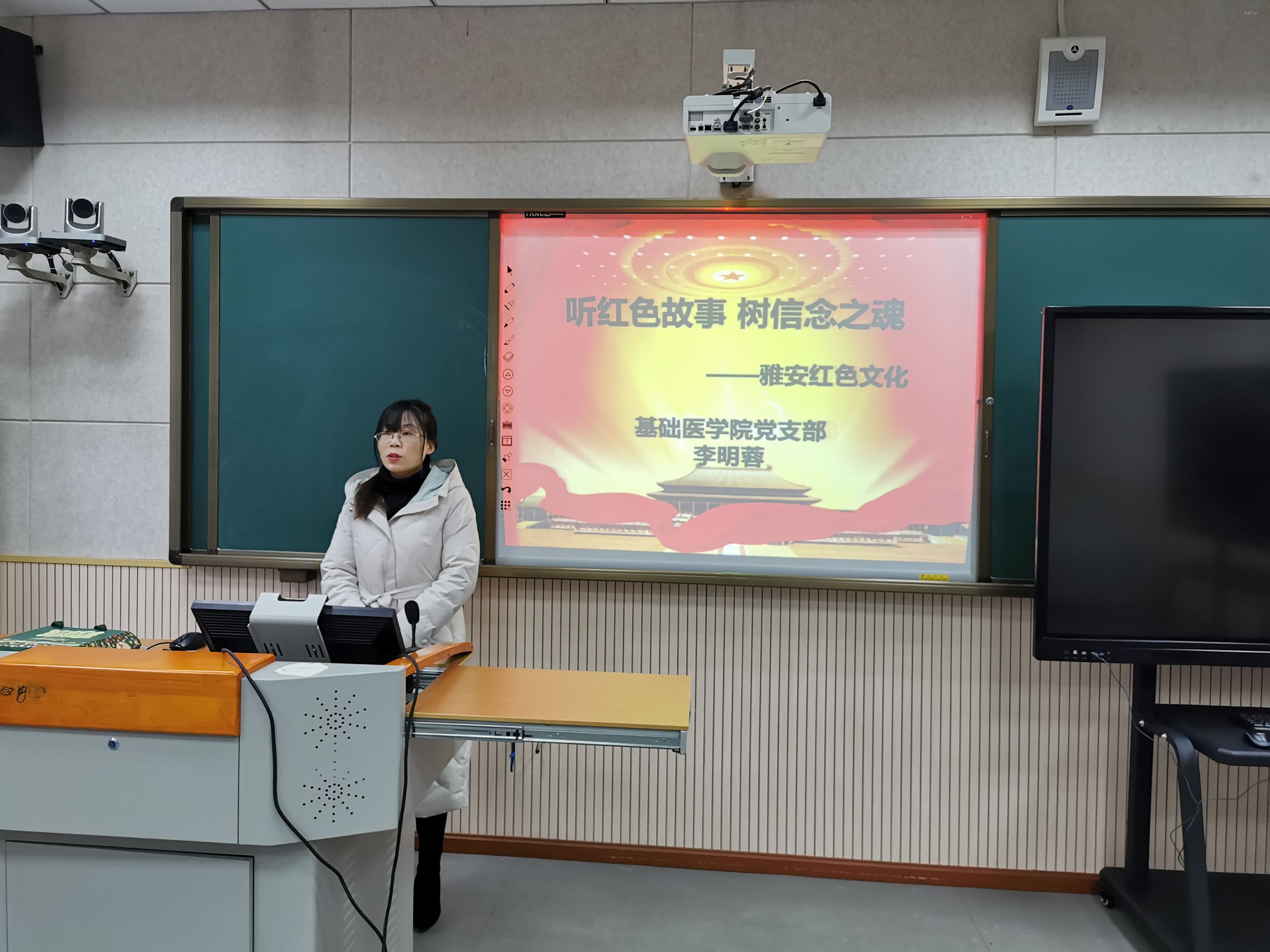 首先,由支部宣传兼维稳委员李明蓉以“听红色故事 树信念之魂”为题讲了一堂生动的党课。她以上里红军碑林、红军翻越夹金山、红军强渡大渡河历史为背景,结合视频播放讲了3个感人肺腑的故事。听完故事,老师们表示,不能忘记那些为了和平,为了祖国的胜利而抛头颅洒热血的烈士们,如果没有他们昨日的牺牲,祖国就不会有今天的辉煌!