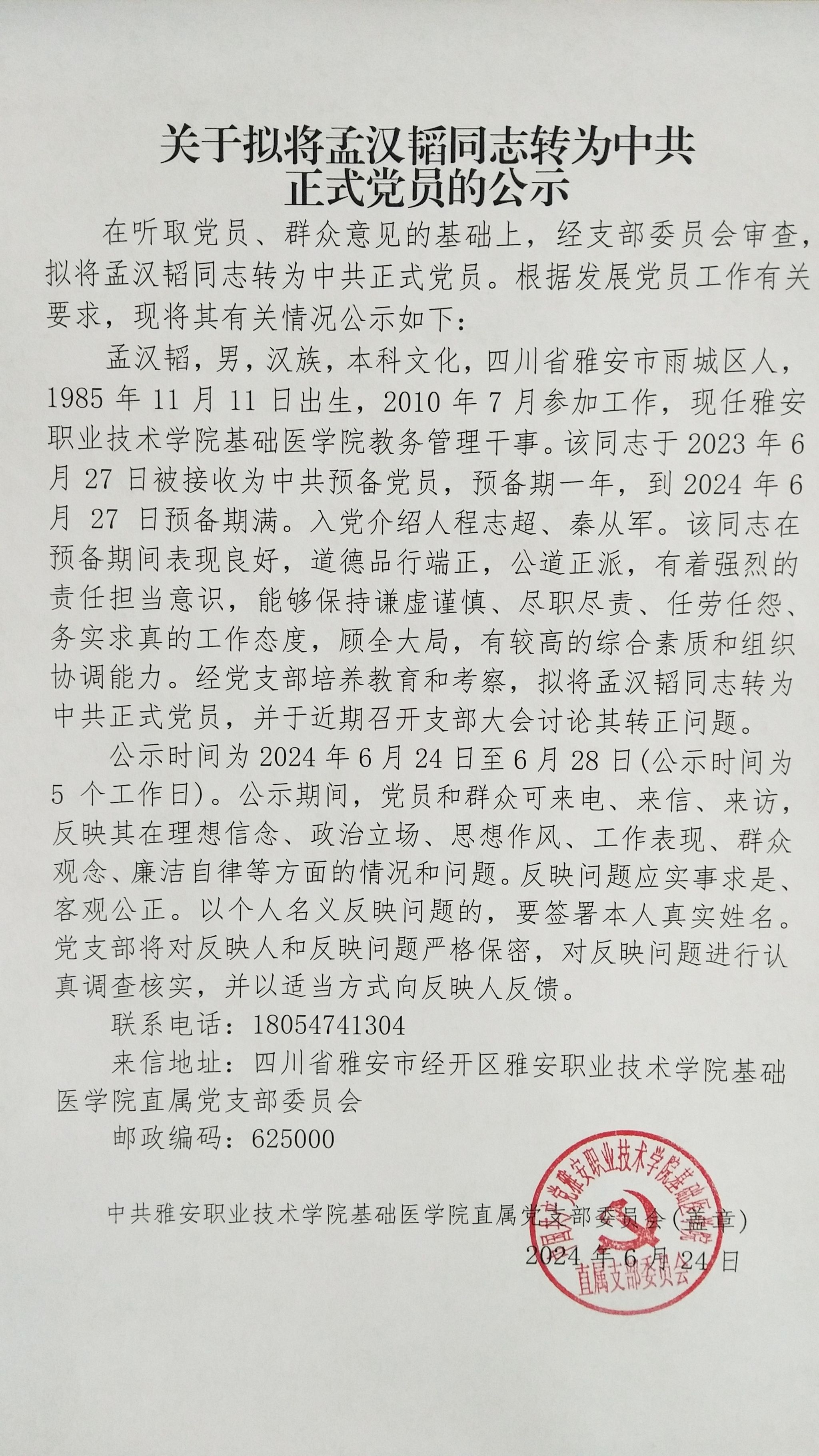 关于拟将孟汉韬同志转为中共正式党员的公示