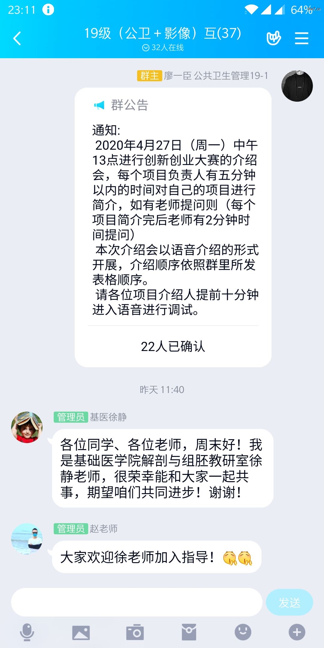 “百舸千帆敢闯新时代,起舞弄潮绘创世界梦”,为激发老员工的创造力,培养造就“雅职青年创业人”,能为社会创业人输入新鲜血液,按照今年老员工互联网+创新创业大赛赛程设置,SUNBET申博普专19级公共卫生管理专业和普专19级医学影像技术专业共计24个创新创业项目在辅导员赵武博的有序组织下于4月27日中午1点通过QQ群直播平台率先开展线上介绍会。SUNBET申博徐静、王贞和刘昌明作为结对指导老师全场参与本次介绍会,与各项目组同学积极交流互动。