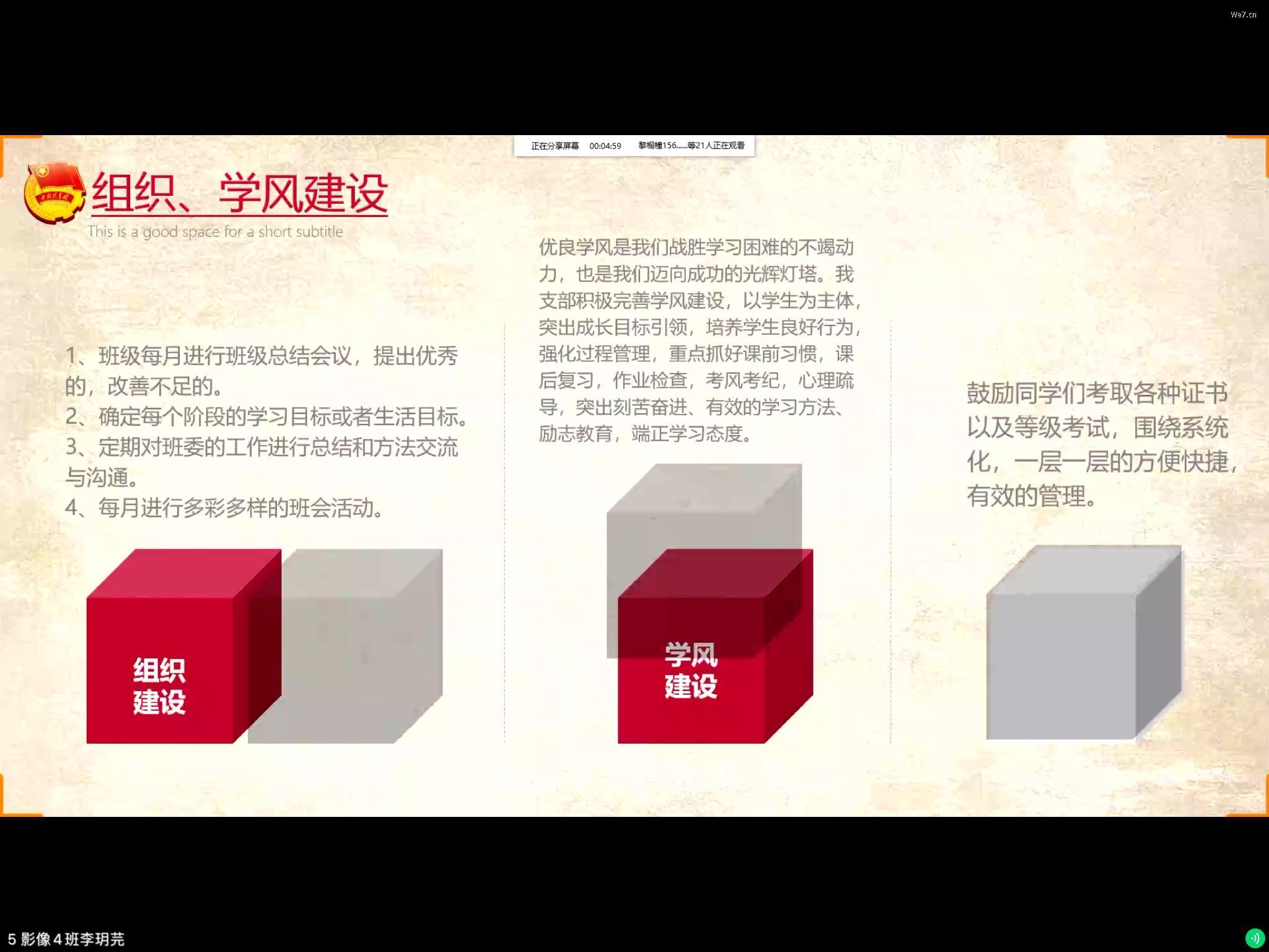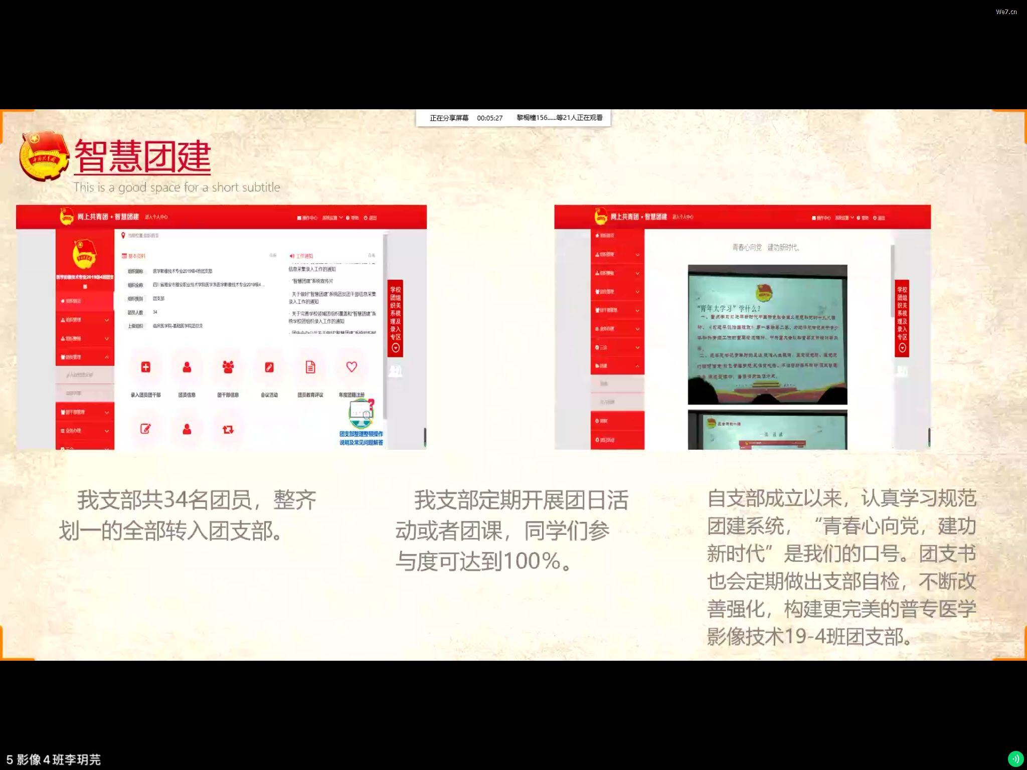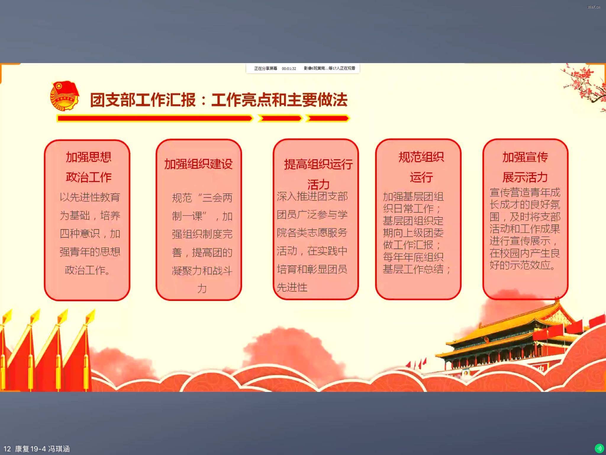 此次评选活动在疫情防控期间通过QQ群课堂云选拔的形式开展。各支部代表分别从本支部的思想建设、组织建设、学风建设和团日活动等方面用简短凝练的语言通过PPT展示讲解和评委在线提问回答的形式进行了汇报,充分展示出支部的主题团会、支部荣誉等方面的魅力与特色,传递出积极向上的精神风貌,发挥了带头示范作用。