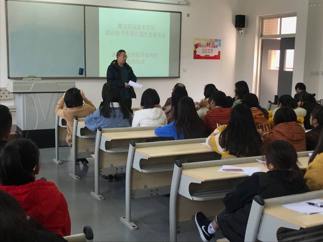 签约仪式上,宋峰表示希望定向医员工要珍惜来之不易的学习机会,顺利地完成学业,为工作打下良好的基础。胡燕详细地为同学们介绍了眉山农村医员工定向培养、定向就业的有关政策,并向同学们发放了定向培养就业协议书,耐心地为同学们和家长解答疑问。薛正毅介绍了公司近年来培养的雅安农村定向医员工的发展好形势,鼓励同学们抓住机遇找准定位,怀揣感恩的心,努力学习专业知识,扎实医学基本技能,为自身职业发展做好规划和准备。在仔细研读眉山市农村医员工定向培养就业协议之后,50名同学按区县完成了签约。