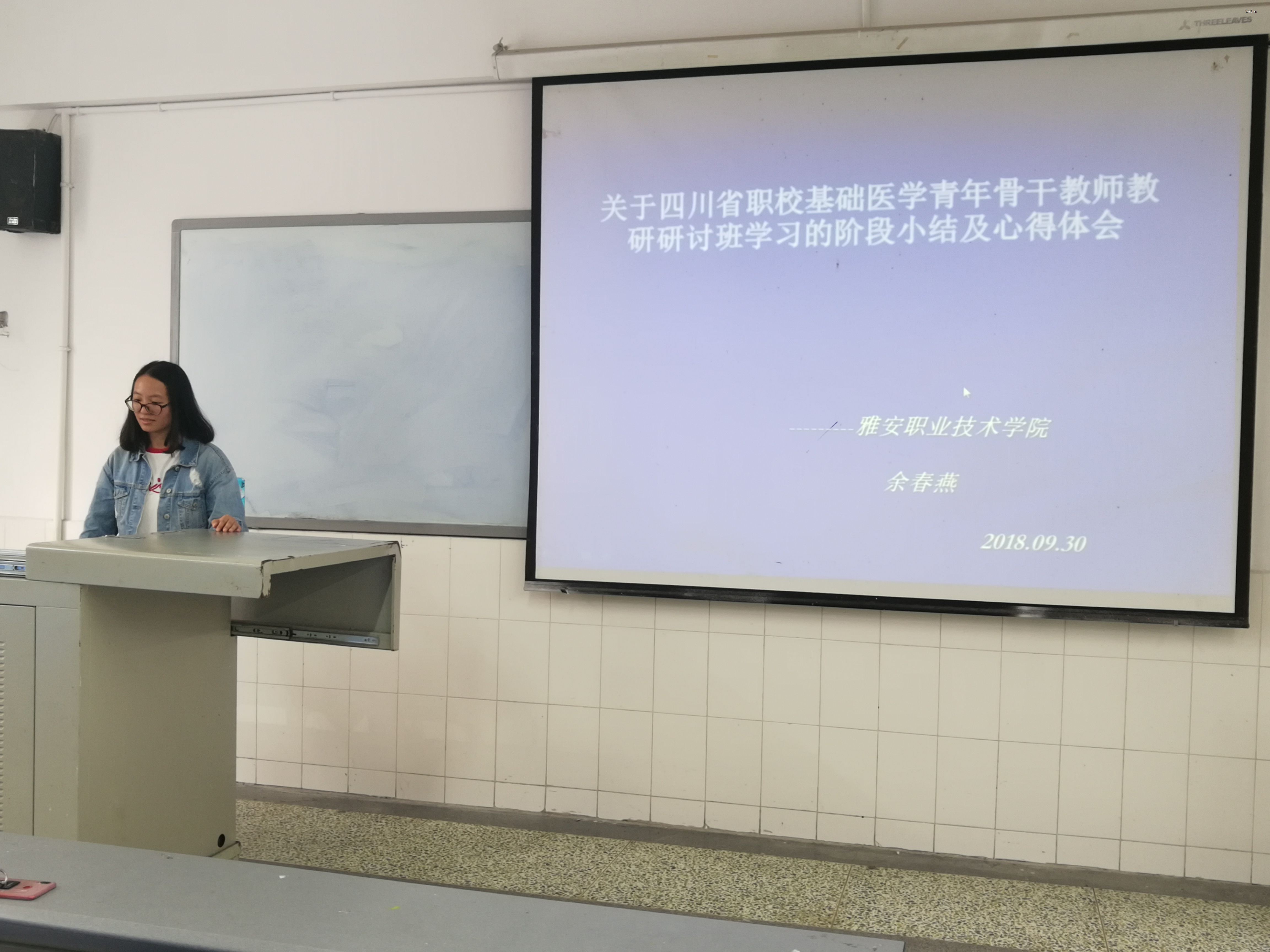 2018年09月29日下午,SUNBET申博生理教研室的全体老师在公司青年路校区开展了教研活动,本活动有两个主题,一是由余春燕汇报参加“四川省职校基础医学青年骨干教师教研研讨班”学习的阶段性心得汇报,二是根据余春燕汇报内容进行研讨。