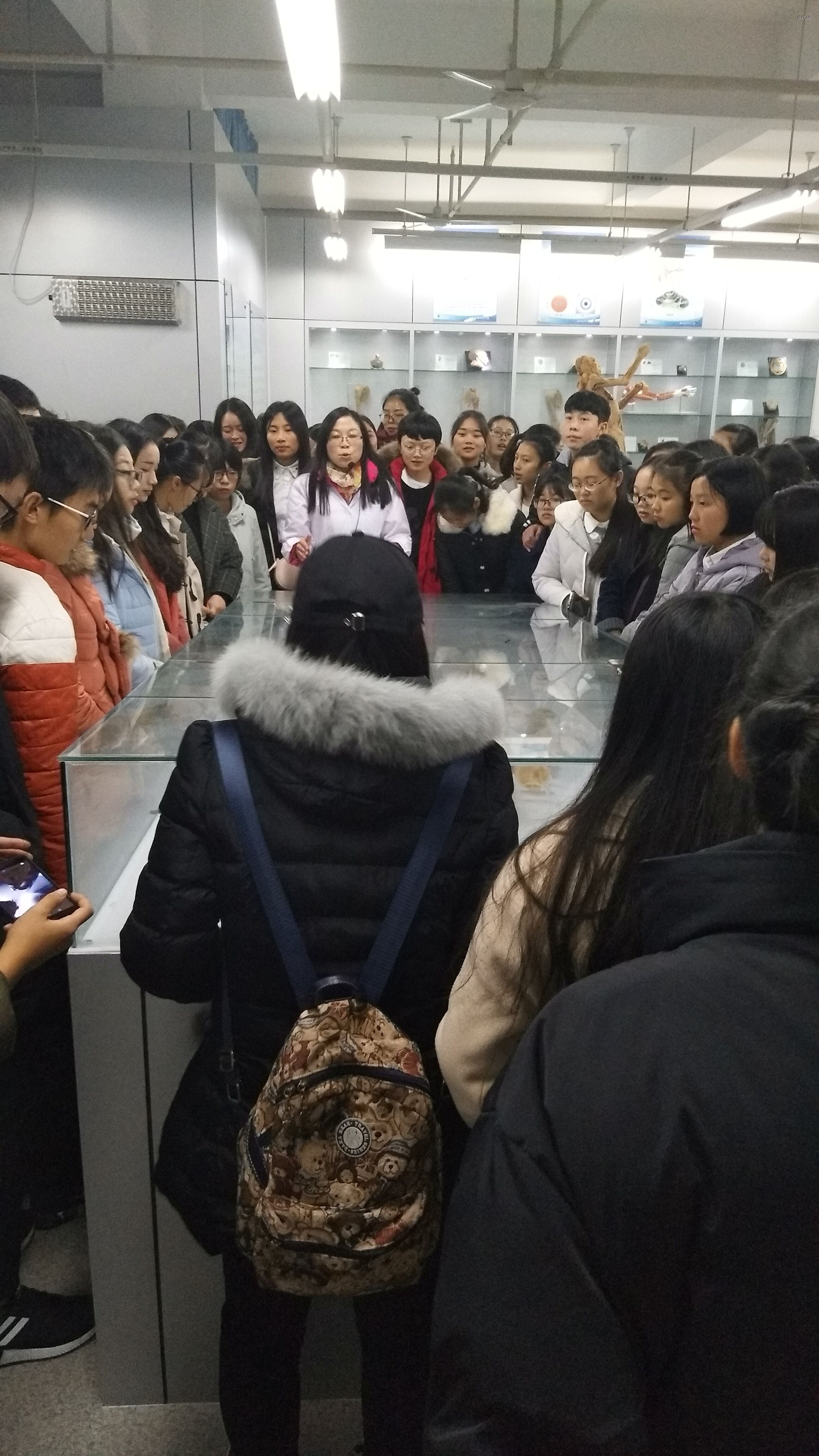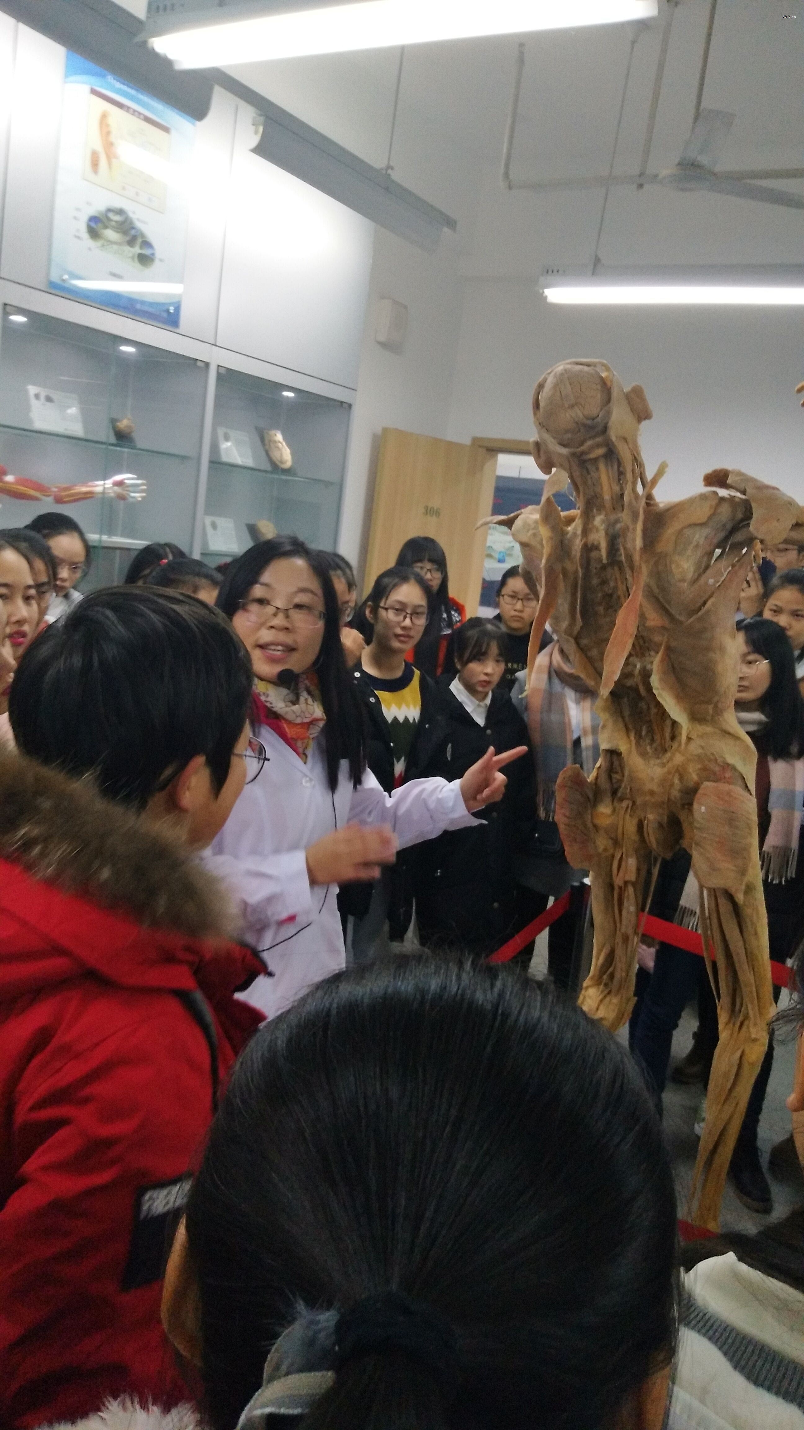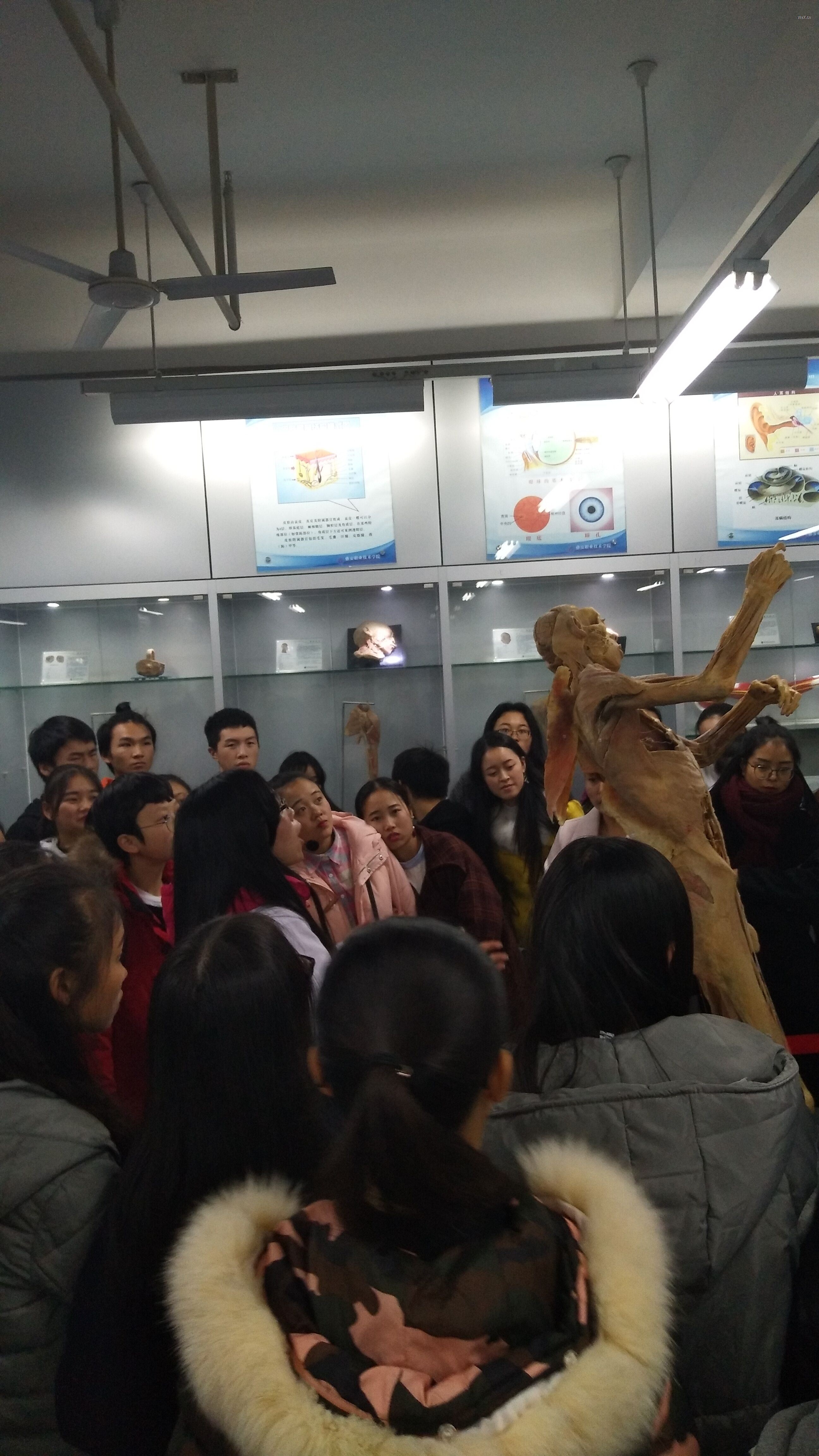 管理员老师引导同学们参观了胚胎展区、内脏展区、科普教育展区等八大展区。讲解了人体各系统的结构要领、胚胎的发生发育、吸毒的危害、CPR的技术要领等。为加深同学们对人体结构的理解和认识,激发同学们思考和分析问题的能力,老师在讲解的过程中还专门留下6个问题让同学们思考:1、臀部注射在哪个位置?2、请问一个人一个月可做多少次X光检查?3、病理展区标本的优缺点有哪些?4、脉管系统全身血管网铸型标本中蓝色、红色分别代表什么?5、如何分辨男女性骨架?6、正常人的肺部是什么颜色?如何判定婴儿是出生前死亡还是出生后死亡?这极大的引发了同学们学习和思考的兴趣,大家积极讨论并回答,最后老师在多媒体示教区听取了大家思考讨论的结果并总结。