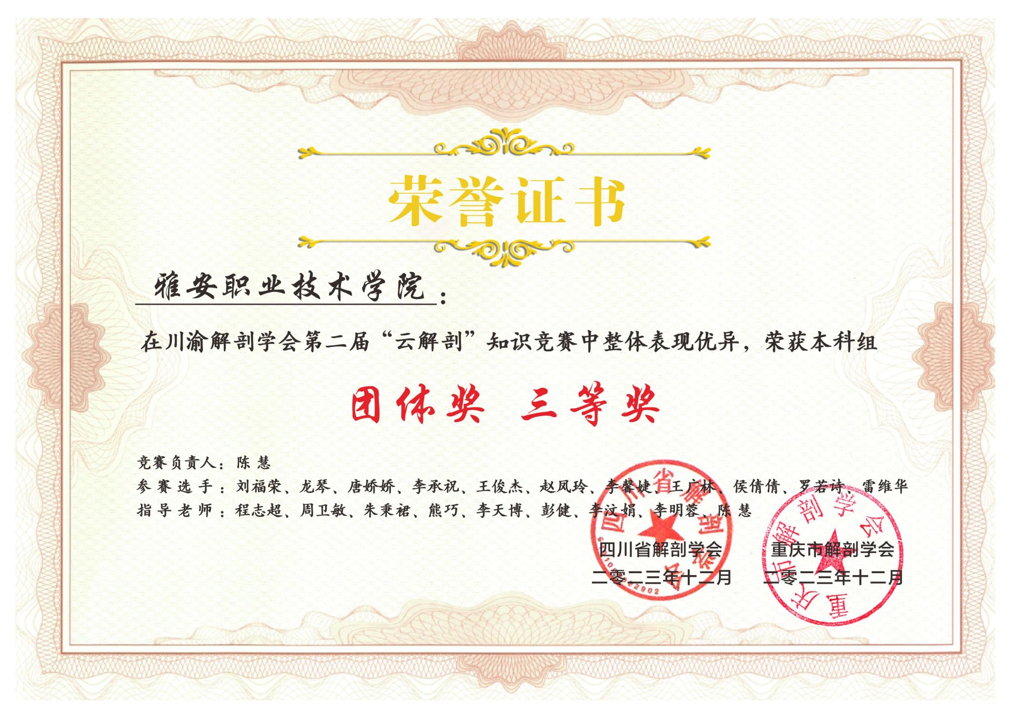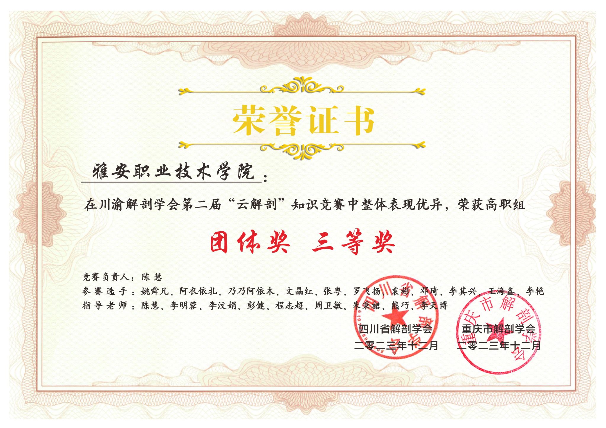 2023年川渝解剖学会学术年会于20231215-17日在重庆涪陵第三军医大学召开。公司为理事会成员单位,陈慧、李明蓉两位老师参加了本次学术年会,成功入选为第十届会员大会代表,陈慧进入换届选举大会领导小组。大会对川渝第二届“云解剖”知识竞赛的获奖单位进行了颁奖,公司分别获得本科组竞赛和高职组竞赛三等奖。
